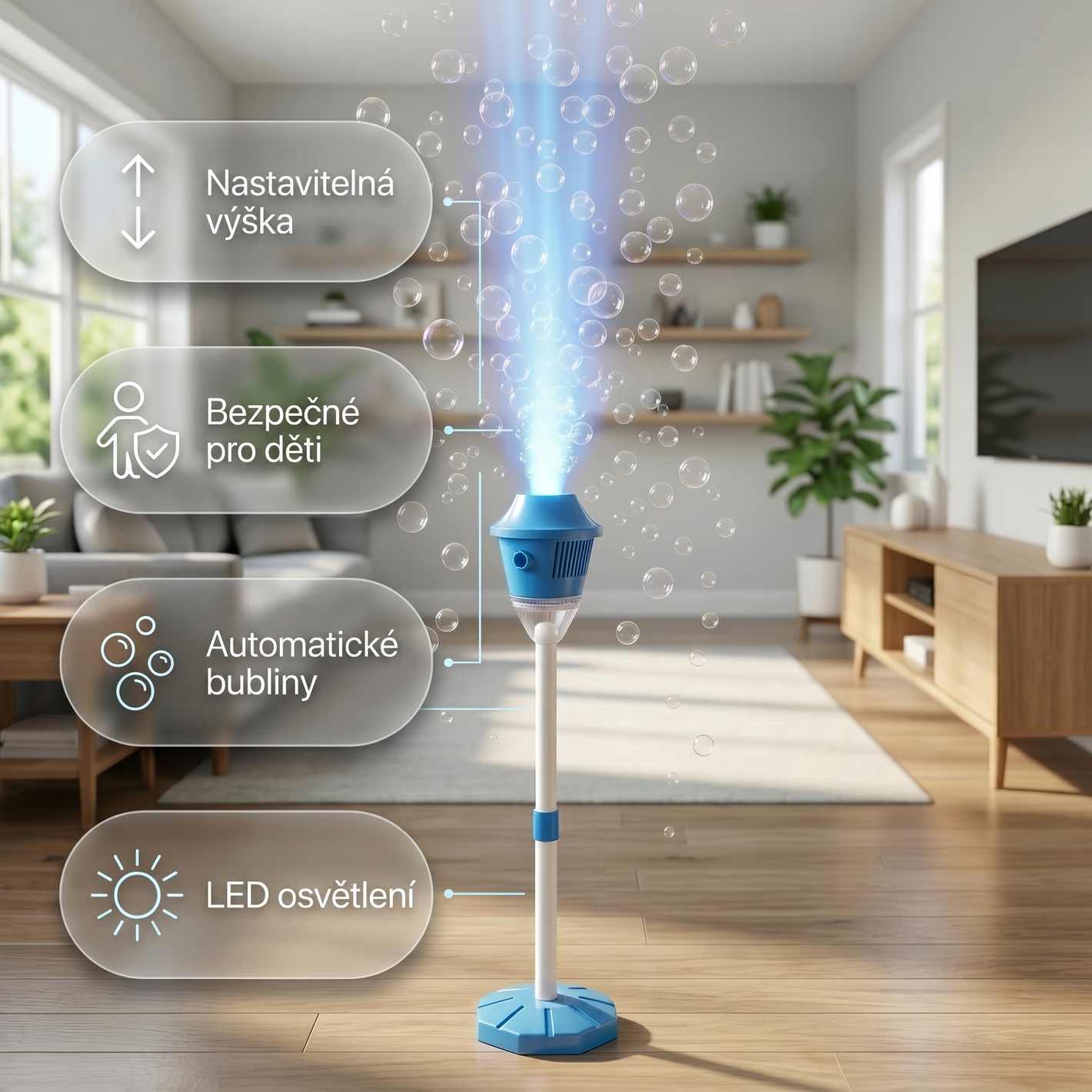 Produkt se snadno ovládá a je bezpečný pro děti. Stačí jedno kliknutí a začne kouzelný efekt bublinek.